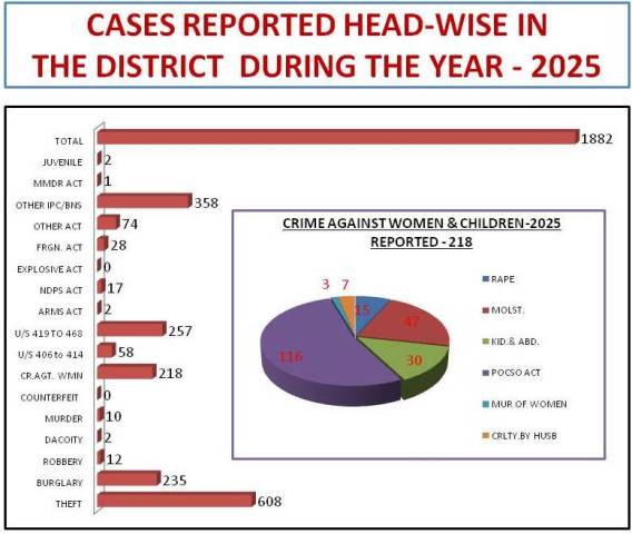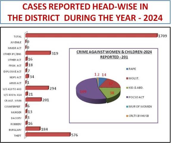 | Year | Case Reptd | Theft | Burglary | Rbry | Dcty | Mdr | Cr.Agt. Wmn | Cntrft | U/S 406 to 414/ 316-317 BNS | U/S 419 to 468/ 318-319 & 336 BNS | Arms Act | Ndps Act | Frgn. Act | Expl Act | Other Act | Other Ipc/BNS | Juve Act | MMDR Act | Total |